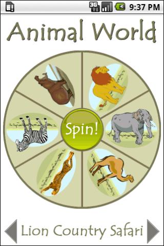 Each wheel is filled with six animal pictures. Tap the Spin button to spin the wheel. Play the animals in order or switch to random mode. Hear the animal's sound and its name spoken.