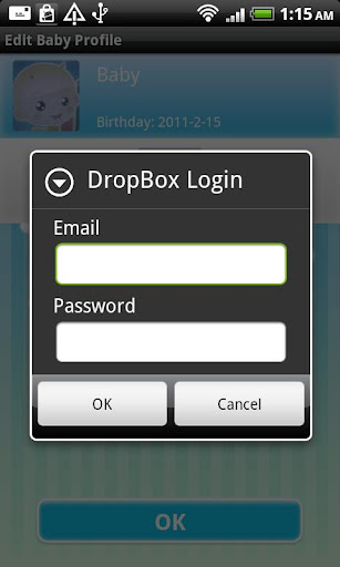 2. Enter dropbox account/password when you try to Backup/Merge online in Baby Daychart. Baby Daychart will sync your data on cloud, you can also install Dropbox on Windows platform to check backup data and images.