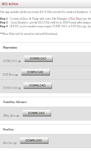 Get all the BIOS files you need to run any BIOS-dependant emulators, such as FPse, PSX4Droid, DroidEMU, Gameboy Advance Emulators, and NeoGeo Emulators.