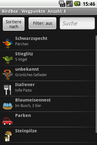 - Speichern von Wegpunkten, wie z.B. Vogelsichtungen oder anderen Naturbeobachtungen, mit Name, Symbol, Beschreibung, Datum und GPS-Koordinate