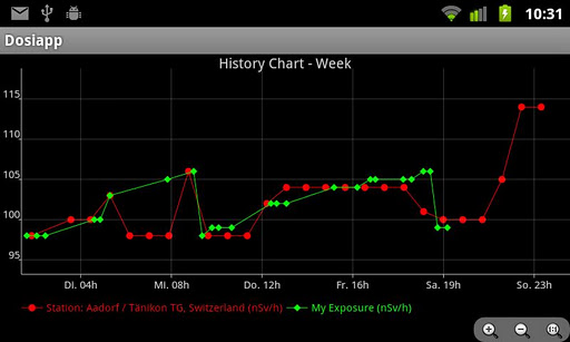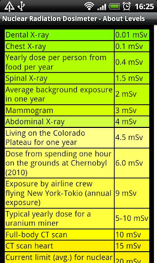 Wissen Sie wie viel radioaktiver Strahlung Sie tagtäglich ausgesetzt sind? Kennen Sie die radioaktiven Quellen in Ihrem Umfeld? NUCLEAR RADIATION DOSIMETER summiert auf professionelle und zuverlässige Weise Ihre Strahlenexposition. NUCLEAR RADIATION DOSIMETER zeigt Ihnen die aktuelle radioaktive Strahlung an Ihrem Aufenthaltsort an und summiert zusätzlich automatisch die radioaktive Belastung durch Zigarettenrauch, Nahrung und die durch Reisen im Flugzeug. Medizinische und anderweitige Belastungen werden in Zukunft durch einfaches Antippen im Auswahlfeld hinzugefügt. NUCLEAR RADIATION DOSIMETER präsentiert die gesammelten radioaktiven Belastungen über eine ausgeklügelte Visualisierung. Ihre radioaktive Belastung wird permanent auf den zu erwartenden Jahreswert hochgerechnet und Standardwerten gegenübergestellt.
