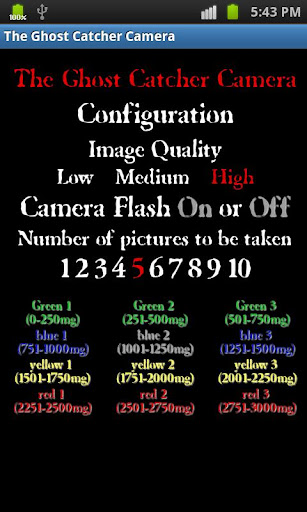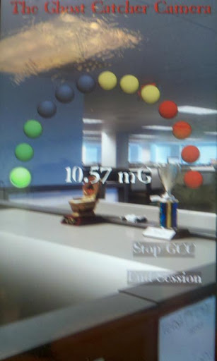 The application consists of a K2 style EMF meter that ties into the Android phones camera capabilities. By doing so, the second the EMF field reaches a certain level defined by the user, the internal camera snaps multiple photos in succession at the rate of up to 10 in a 2 second period. Once the G.C.C. is started it automatically calibrates the sensor to 0. The photos happen silently as to not affect the continuous reading of the meter. The photos are then stored directly on the SD card for further review. The G.C.C. can be stopped and started as necessary, and once a session has ended (which is an option) a full graph of the session is shown. The graph includes the time the session started and ended as well as the level of EMF defined in 250 miligauss increments. This graph then also offers the option to be saved along with a log showing the start and stop time as well as the lowest and highest miligauss reading. Another option is also available that will allow the user to email this same information along with a .jpg attachment of the graph.