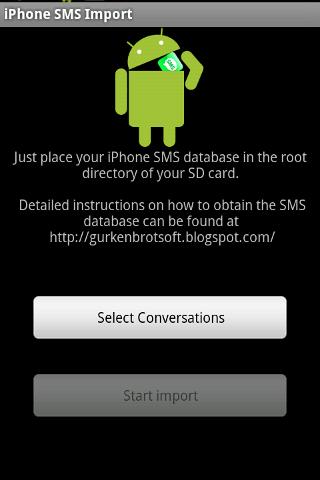 | Name: iPhone SMS Import Entwickler: Gurkenbrot Software Preis: Größe: 47k | Version: 0.1.1 minimale Android Version: 2.1 oder höher Kategorie: Tools Download: Look at the bottom of the page |