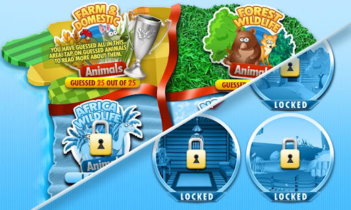 Kids Animals contains over 90 questions and educational descriptions for more than 70 animals. The game is divided into four different "zones": Farm and Domestic, Forest Wildlife, Africa Wildlife, as well as North and South Pole. It is intended for children ages 3 to 9.