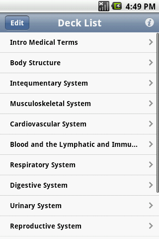 Learn from 13 pre-made decks or create your own decks and cards. You can populate existing decks or self made decks with pre-made entries. You can mark cards correct or incorrect to help track progress.