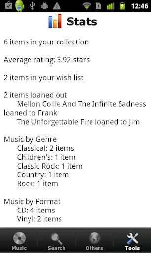 [Früher als Musik + Collection & Inventory] Sind Sie ein Musik Sammler? Haben Sie Schwierigkeiten, den Überblick über all Ihre Musik? Organisieren Sie Ihre Musiksammlung mit diesem App. (Cds, vinyl, mp3, etc.) verwalten Sie Ihre Musiksammlung mit persönlichen Bewertungen und Anmerkungen, die Sie mit anderen teilen oder privat halten können. Prüfen Sie, ob Sie bereits ein Element auf dem Handy, während Sie einkaufen sind. Features • Verwenden Sie die Bulk-Barcode-Scan-Option, um Ihre Musik schnell Scannen des Barcodes auf der Titelseite mit der Kamera des Telefons eingeben. • Denken Sie an die Musik, die Sie kaufen wollen, mit der Wunschliste. • Exportieren Sie Ihre Musik info im CSV-Format als ein Tabellenkalkulationsprogramm auf Ihrem Computer zu öffnen. • Nehmen Sie ein Bild von dem Album-Cover mit dem Telefon zu gehen zusammen mit Ihrer Bewertung und beachten. • Sichern Sie Ihre Musik Daten an den Server. Wenn Sie Ihr Telefon verlieren oder ein Upgrade auf ein neues Handy, nur importieren Sie Ihre Daten auf das neue Mobiltelefon, so dass Sie nicht haben, um wieder in alles. • Track Statistiken über Ihre Bücher wie Gesamtzahl der Elemente in Ihrer Sammlung, Average Rating, Musik nach Genre. (Diese App ist kein Musik-Player und nicht Musik herunterladen, ist es für die Verwaltung Ihrer Musiksammlung.)