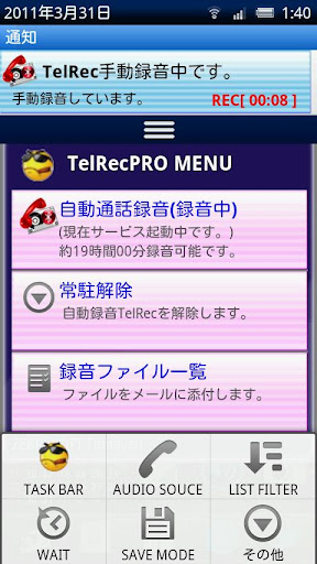 ※TelRecは100%Androidの仕様に準拠しております。従いまして正常に動作しない場合の原因は端末に搭載しているAndroidOSが原因です。へたれメーカーのエンジニアにクレームを入れてください。