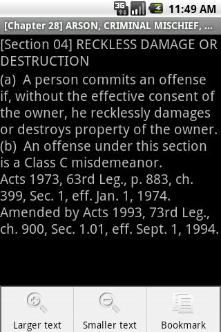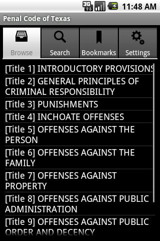 Texas Penal Code for Android is the complete Texas Penal Code in your Android smartphone. It's available in an easily browsable and searchable format, and is suitable for law students or anyone working in law enforcement or in criminal law who doesn't always have access to the internet or to the printed law books.