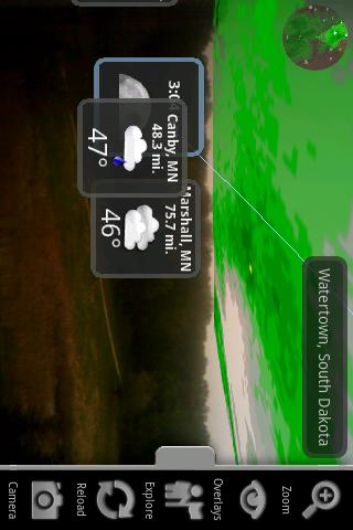 *New version fixes Droid 2 issue* Weather Reality allows you to explore the weather around you in an augmented reality view through the camera of your mobile phone. Check current conditions, real-time radar and severe weather alerts. Track the path of the sun and moon. You can even share geo-tagged weather pictures.