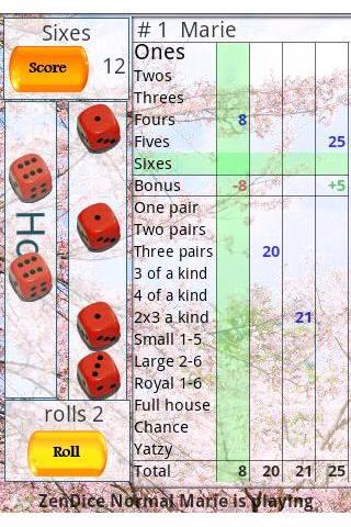 Because there are tons of different rule variations, there is an option to choose the version that your family played when you were growing up. Select your game type from "Normal" (three rolls), "Easy" (four rolls), "TopDown" (you get four rolls, but you have to score everything from the top of the score sheet from ones down to Yatzy in sequence), "BonusScore" (in which scores in the lower section made in one roll receive double points), "RollSaver" (unused rolls are passed to the next round), "5-dice Classic", "NordicClassic" games or an easy variation of BonusScore and RollSaver games with 4 rolls.