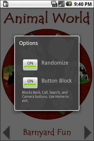 Each wheel is filled with six animal pictures. Tap the Spin button to spin the wheel. Play the animals in order or switch to random mode. Hear the animal's sound and its name spoken.