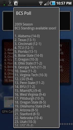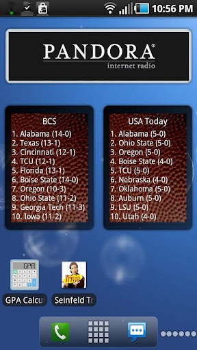Stay up to date with the latest college football rankings with this widget. This widget displays the top 10 teams and their records according to the BCS Standings nicely on your home screen. When pressed, the top 25 teams pop up. The teams and records are updated weekly as soon as the new poll is released.