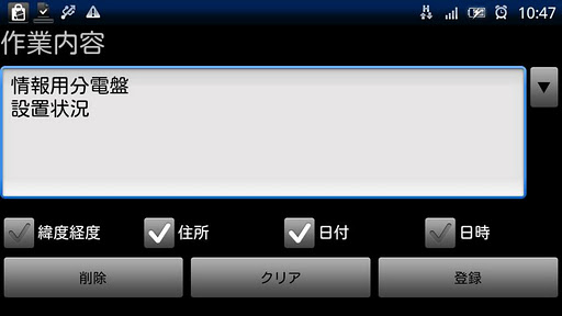 作業内容編集画面では、撮影場所、撮影日時の表示/非表示・表示形式の選択が行えます。