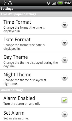 A fancy dashboard that displays the date, time, battery and signal level. The time and date format can be changed and you can choose between different color schemes for day and night mode. Moreover it comes with an alarm clock that also has a snooze function. Tap the screen once for activating the snooze mode, tap it twice for turning the alarm off.
