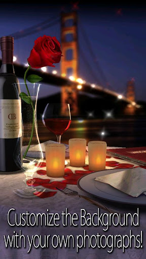 Customize every part of the scene, including your own photograph in the picture frame or background, your custom message for the title, and custom text for the gift card. Floating hearts, balloons, or bubbles drift through the background, or turn off the floating objects altogether. Choose the locale, rose color, table cloth, napkins, and much more! Select one of the preset themes, or customize the items in the scene to in a way that means the most to you and your loved one.
