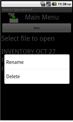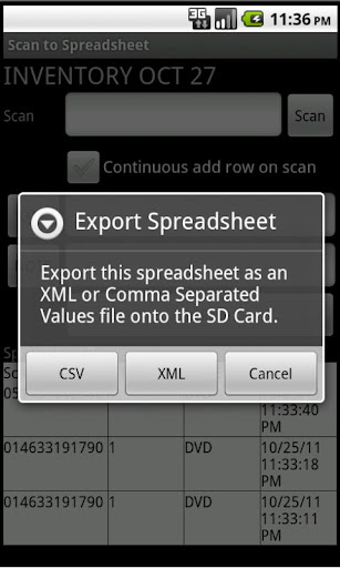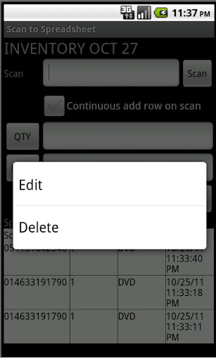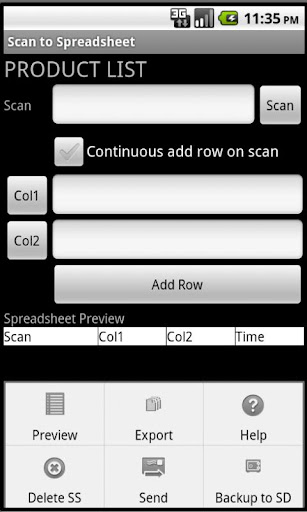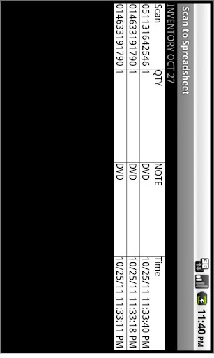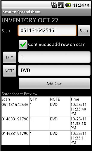Create spreadsheets using the barcode scanner in your Android. Use this for inventory, cycle count, or other times where scanning is needed.