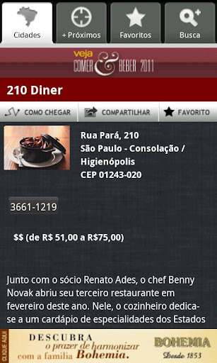 O maior Guia Gastronômico do Brasil traz os melhores restaurantes, bares e comidinhas indicados e premiados por VEJA em 20 localidades brasileiras* agora no seu celular! Disponível para iPhone, iPod e Android, o aplicativo conta com atualizações em todas as categorias sempre que VEJA lança uma nova edição de Comer & Beber na cidade. Além de oferecer todo conteúdo de VEJA Comer & Beber (mais de 10 mil estabelecimentos) com apenas um toque, o aplicativo contempla: